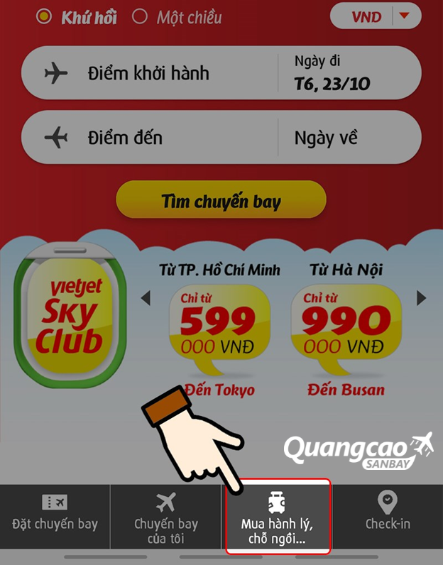Bên cạnh website, hành khách cũng có thể mua hành lý qua ứng dụng Vietjet Air với thao tác như sau: